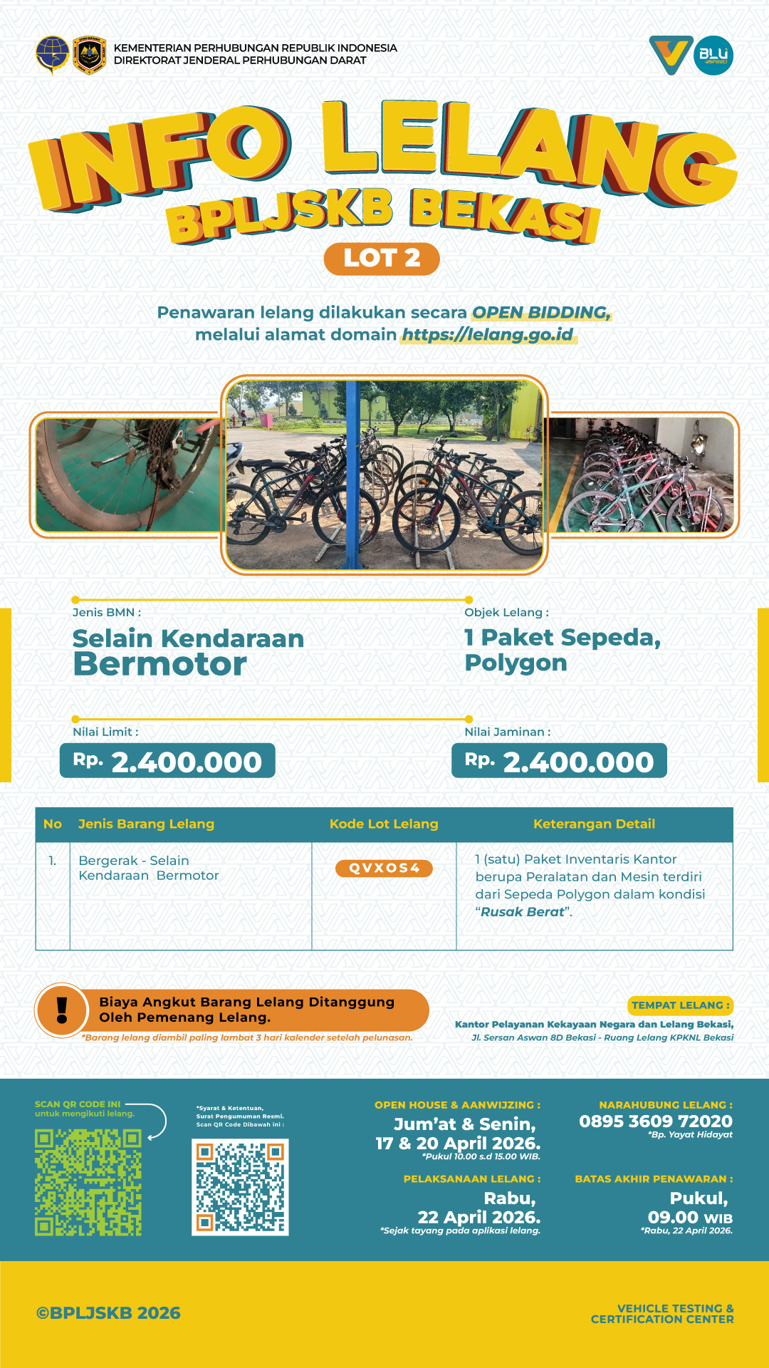 Balai Pengujian Laik Jalan dan Sertifikasi Kendaraan Bermotor (BPLJSKB) melalui KPKNL Bekasi akan melaksanakan Lelang Non Eksekusi Wajib Barang Milik Negara (BMN) berupa 1 paket peralatan dan mesin dari sepeda Polygon dslam kondisi rusak berat.
