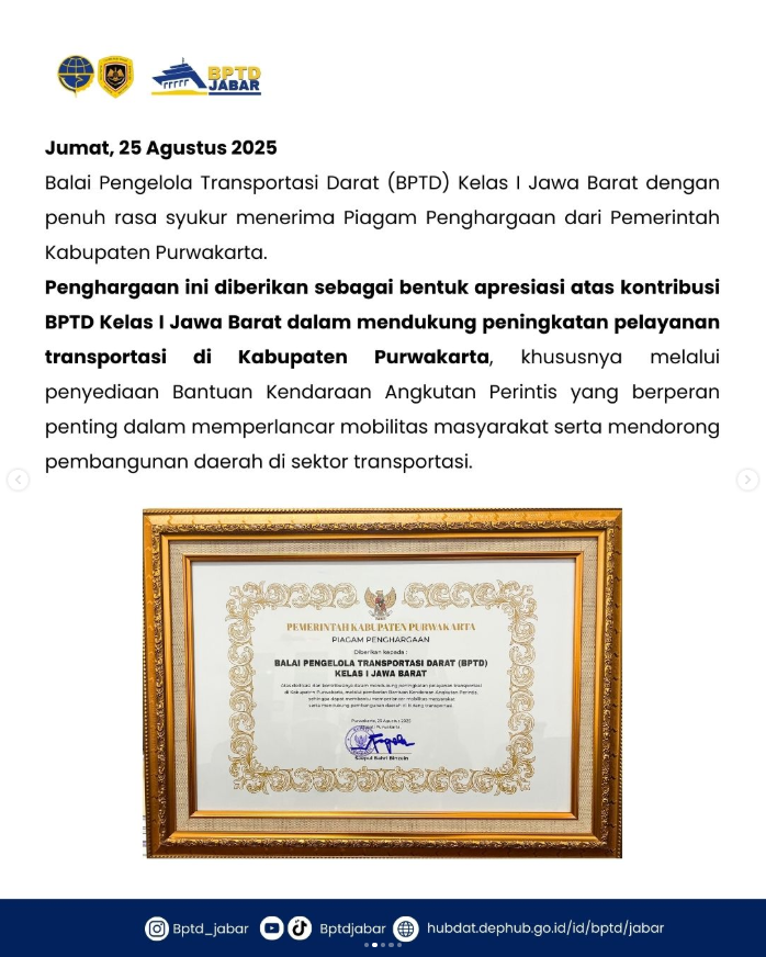 Penghargaan ini diberikan atas kontribusi BPTD Kelas I Jawa Barat dalam mendukung peningkatan layanan transportasi di Purwakarta, khususnya melalui program Bantuan Kendaraan Angkutan Perintis.