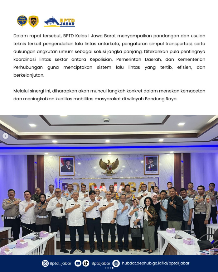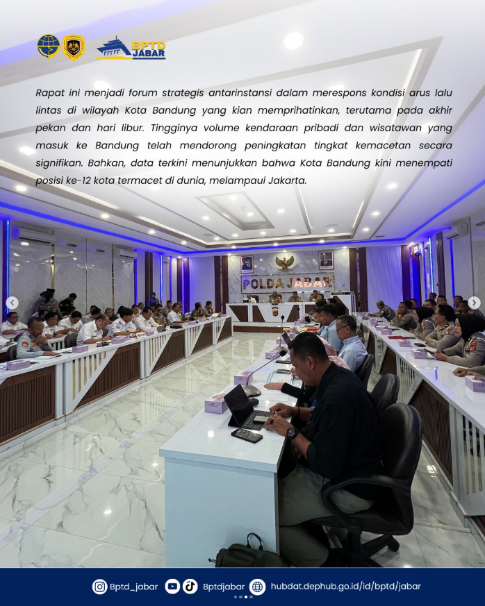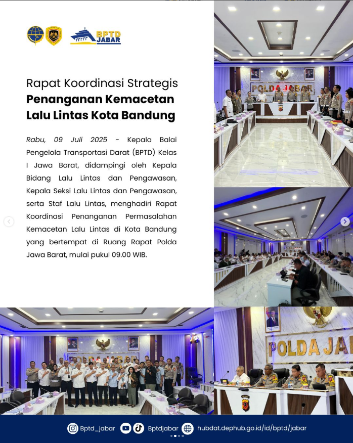 Rabu, 09 Juli 2025, Kepala BPTD Kelas I Jawa Barat bersama Kepala Bidang Lalu Lintas dan Pengawasan, Kepala Seksi Lalu Lintas dan Pengawasan, serta Staf Lalu Lintas menghadiri Rapat Koordinasi Penanganan Permasalahan Kemacetan Lalu Lintas di Kota Bandung, bertempat di Ruang Rapat Polda Jawa Barat.