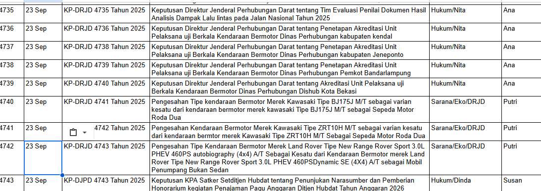 Informasi mengenai surat menyurat, proses penomoran surat masuk, surat keluar, Nota Dinas, Peraturan/Kep utusan Direktur Jenderal Perhubungan Darat Lihat - Data Operasional Perkantoran Direktorat Jenderal Perhubungan Darat